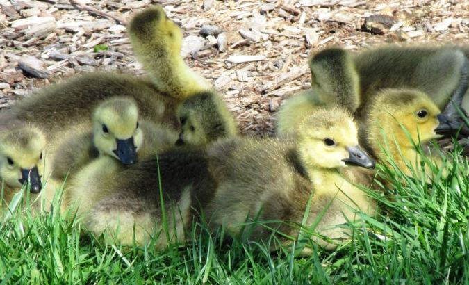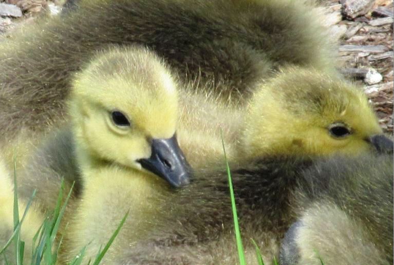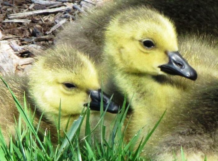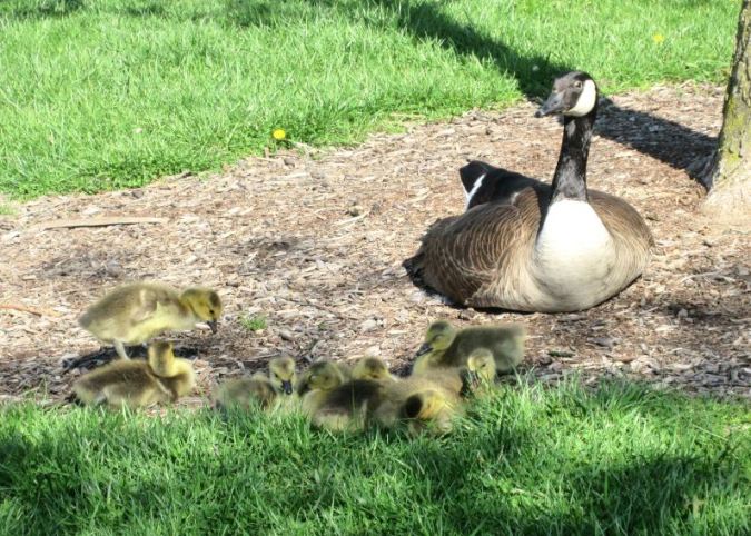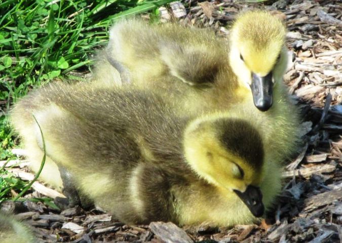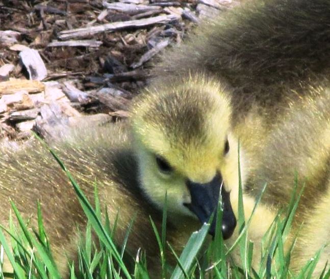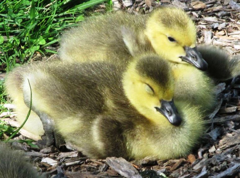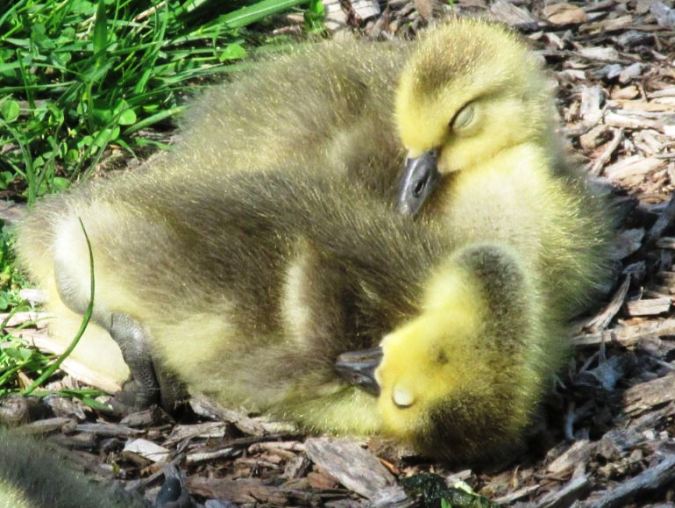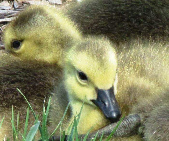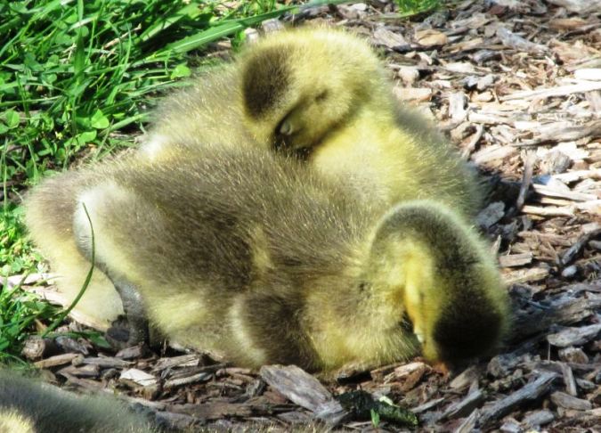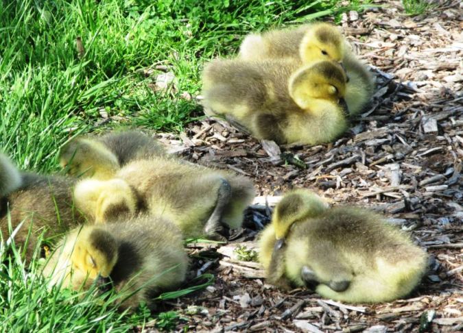 I love seeing the goslings when they are a day or two old, fuzzy little lemon drops, snoozing, or those wiggle butts running after their parents, biting the dandelion tops off, or peeking at me between the blades of grass.