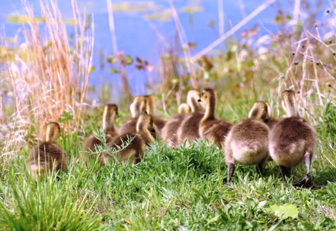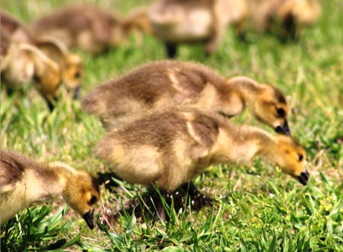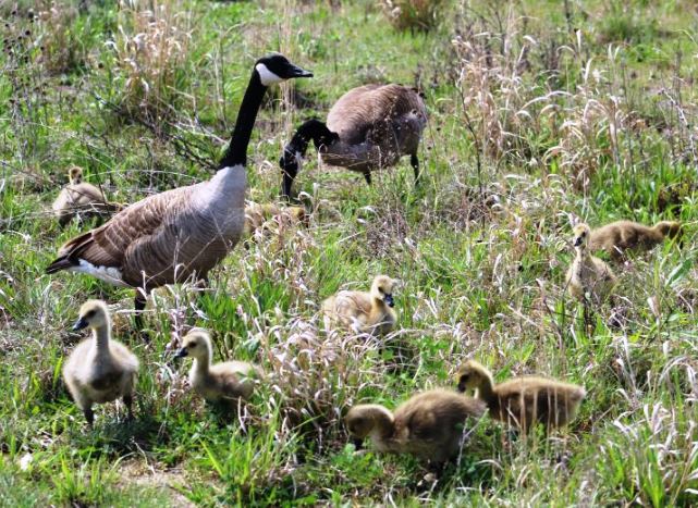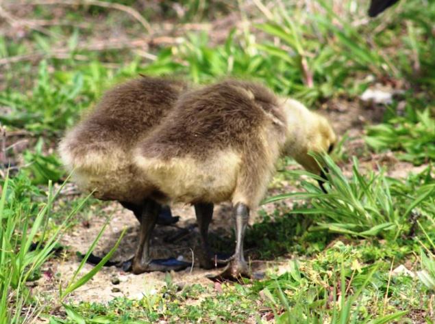… then set them free to grab breakfast. Now, if it were squirrels, they would look for a human toting peanuts, but the goslings headed for the grass to graze. They found a patch of grass which was not particularly green yet as we were having a chilly May.