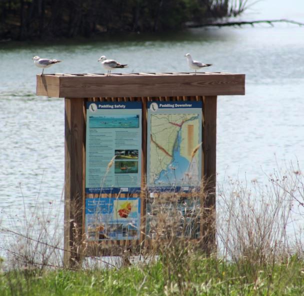A trio of seagulls perched on an info sign after they landed there simultaneously … still practicing social distancing I see.
