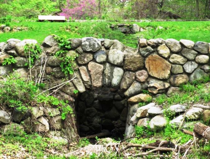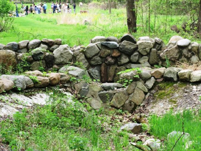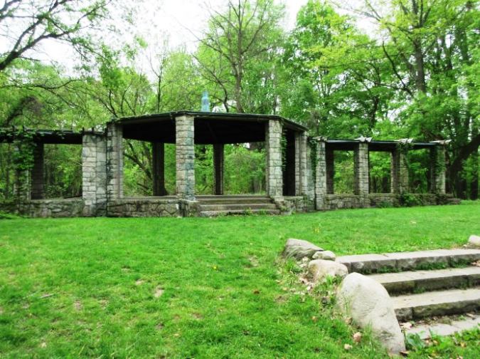 I listened in as the guide gave the group a quick history lesson. We learned that even though architect Jens Jensen was instrumental in working with Henry Ford to create a natural environment around the dam and creating the Meadow and bird sanctuary, in the late 1920s Clara Ford insisted on creating a 2.5-acre rose garden, ripple waterfall and pond, reflecting pool, garden structure (“The Summer House”) and pergola in the middle of the area known as the Meadow. Jens Jergens disagreed with that idea, so Clara Ford promptly secured another architect, Herbert Kellaway, to create these amenities and commissioned horticulturist/rosarian Harriet Foote, an expert in rose cultivation to create a “keyhole rose garden” all which are mere ruins now. Below is the frame, all that remains of the Summer House/Pergola.