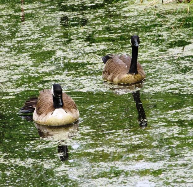 The water looked murky as two geese paddled side by side, their reflections barely visible.