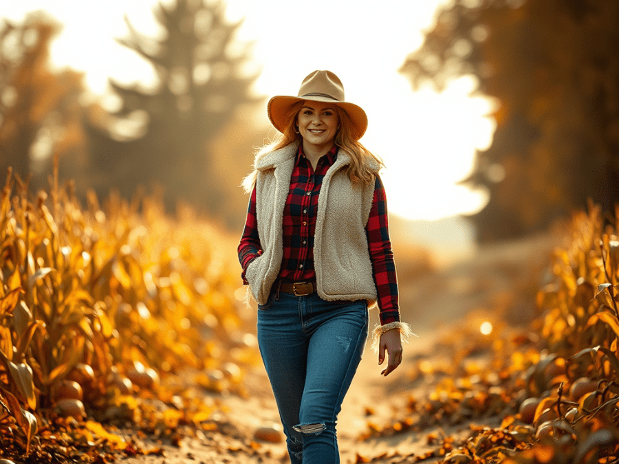 woman-scarecrow-walking-in-stewart-plaid-flannel-shirt-beige-sherpa
